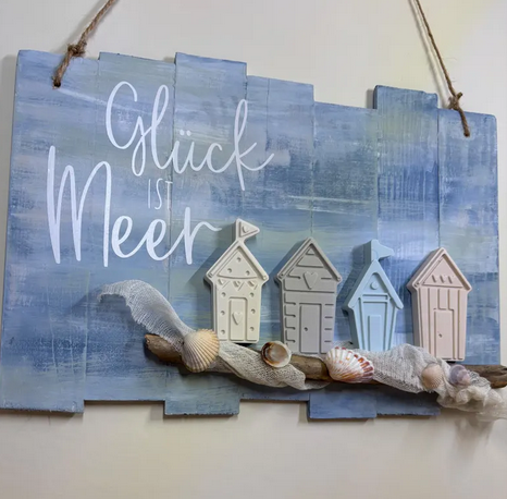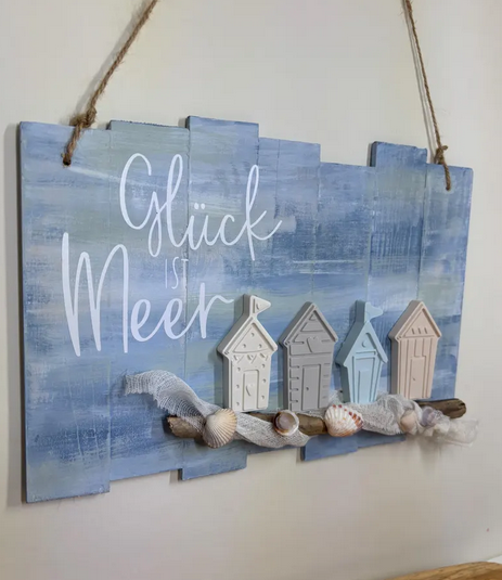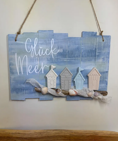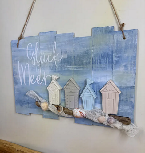 Die Kombination aus sanften Blau- und Naturtönen sorgt für einen authentischen Beachhouse-Look. Kleine Strandhäuser, Muscheln, Treibholz und ein dekoratives Netz machen diese maritime Wanddeko Holz zu einem besonderen Hingucker. Der Schriftzug „Glück ist Meer“ verleiht dem Schild eine emotionale Note und erinnert täglich an schöne Momente am Meer.